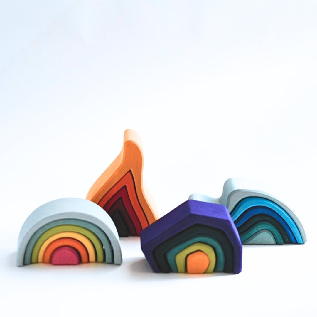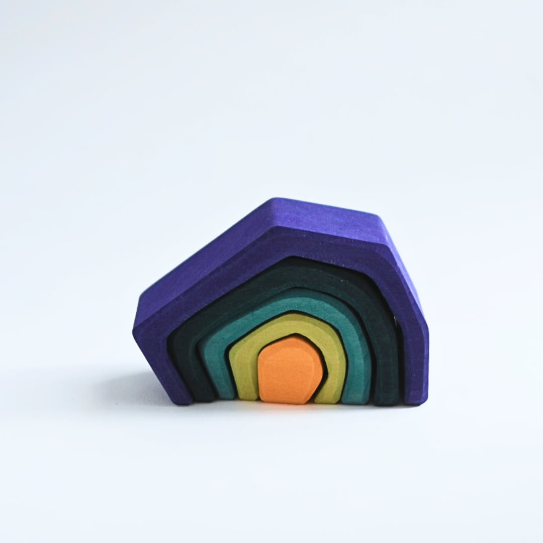 グリムス社のおもちゃは見た人がはっとするほど美しい色彩が特徴です。特に組み立てて完成させる遊びにおいては、カラフルな色彩で遊びの幅が広がっていきます。