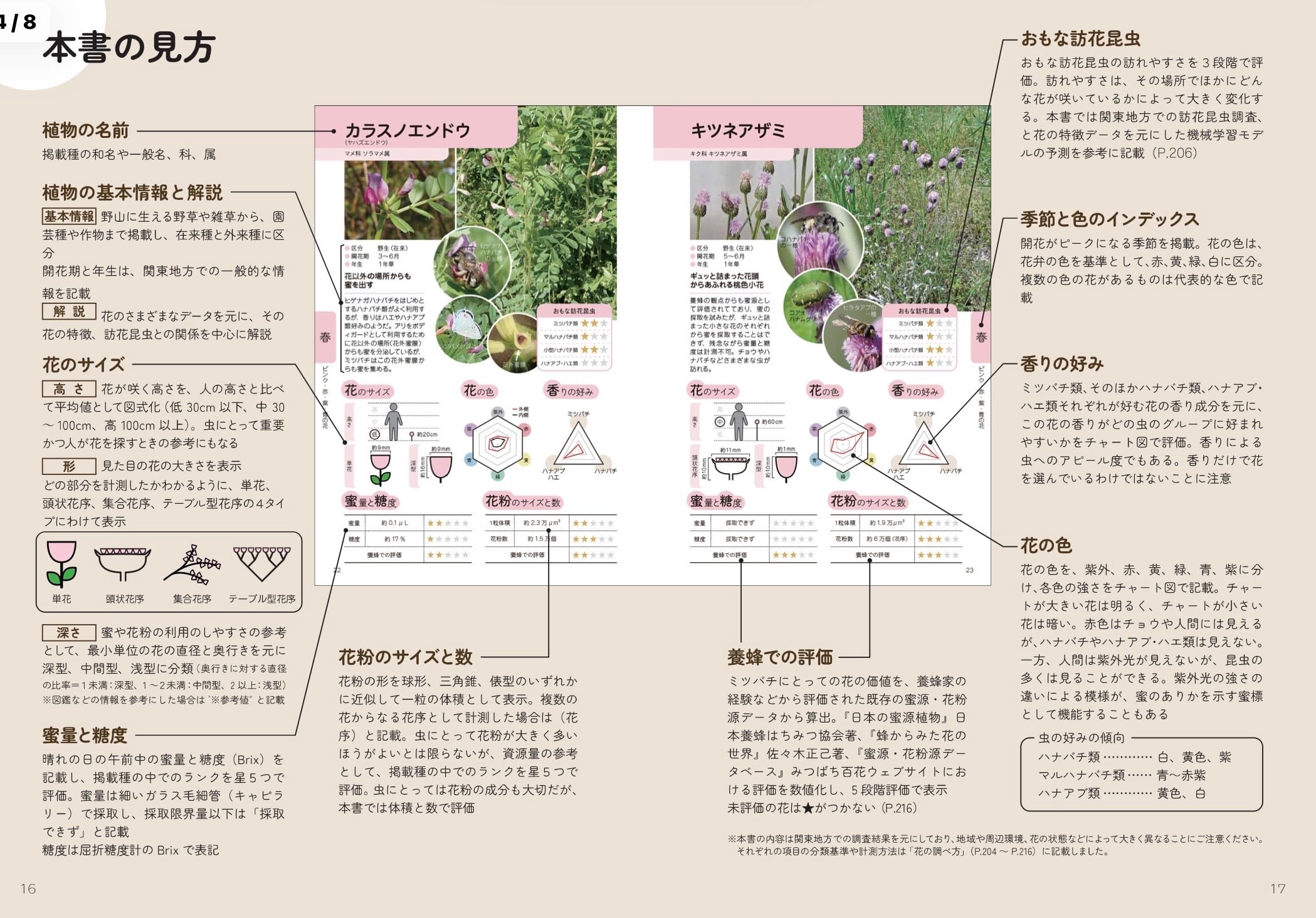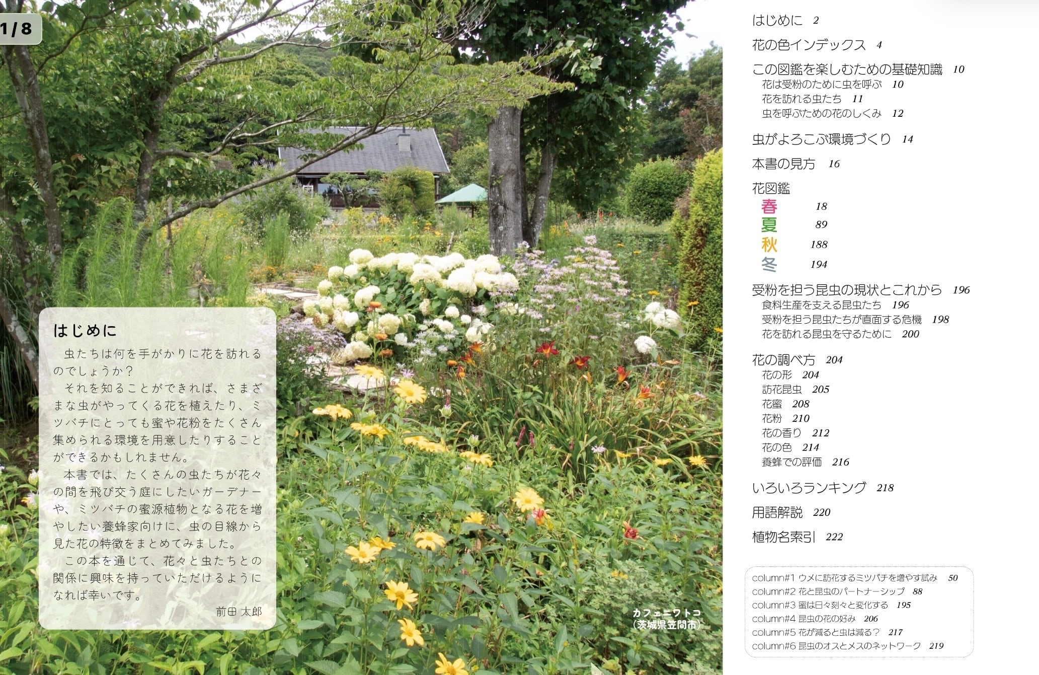 園芸種はもちろん、野山や道端の花、作物の花について、訪れる虫の種類と、訪れる虫が好きな花の色、香り、形などがわかる